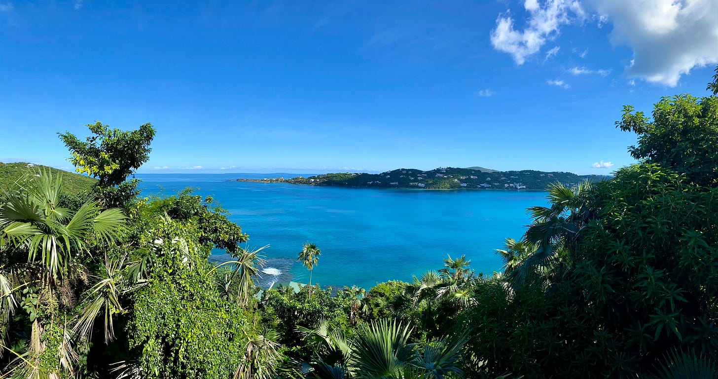 It was a very chilly first few days of 2025. Ian and I were looking forward to our honeymoon, and escaping to some sun and sand. Watching the weather forecast, I was actually afraid we wouldn’t be able to go at all—a serious winter storm was due, which in Virginia can make driving unsafe pretty quickly. Thankfully, the roads were passable when we set off at 5 AM, and we drove through snow at 16 degrees to the Richmond airport, where a water main break had left the entire airport without water. (Imagine: no bathrooms at an international airport, nor on the planes. It was wild!) It was a short trip to connect in Atlanta (hallelujah, running water), and then on to the tiny airport in St. Thomas. We stepped off the plane into what felt like another world—85 degrees, sunny, surrounded by lush mountains plunging into a vibrant azure sea. Even though St. Thomas is the most developed of the three US Virgin Islands, it’s still mostly forested land.